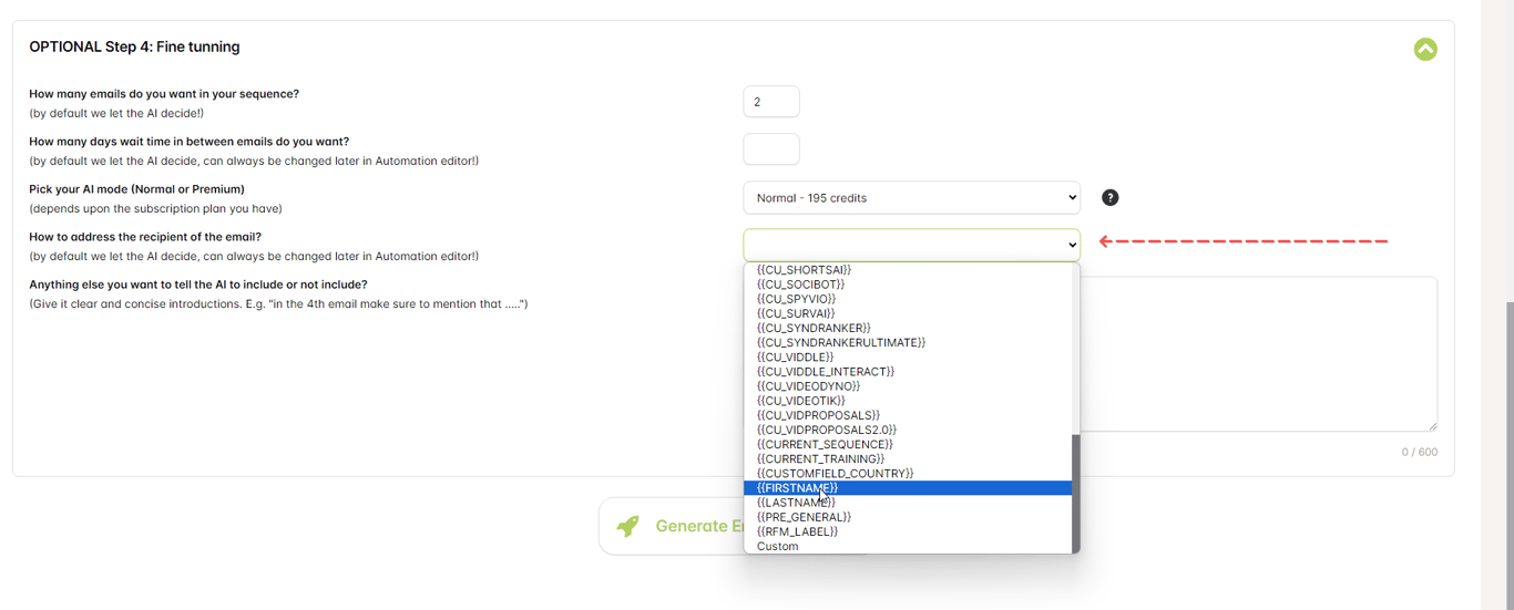 Before this update, the AI would use a random tag like [Recipient name] or something else in the generated emails. However, these tags are not recognized by the Email Marketing module when you save the sequence as an automation.